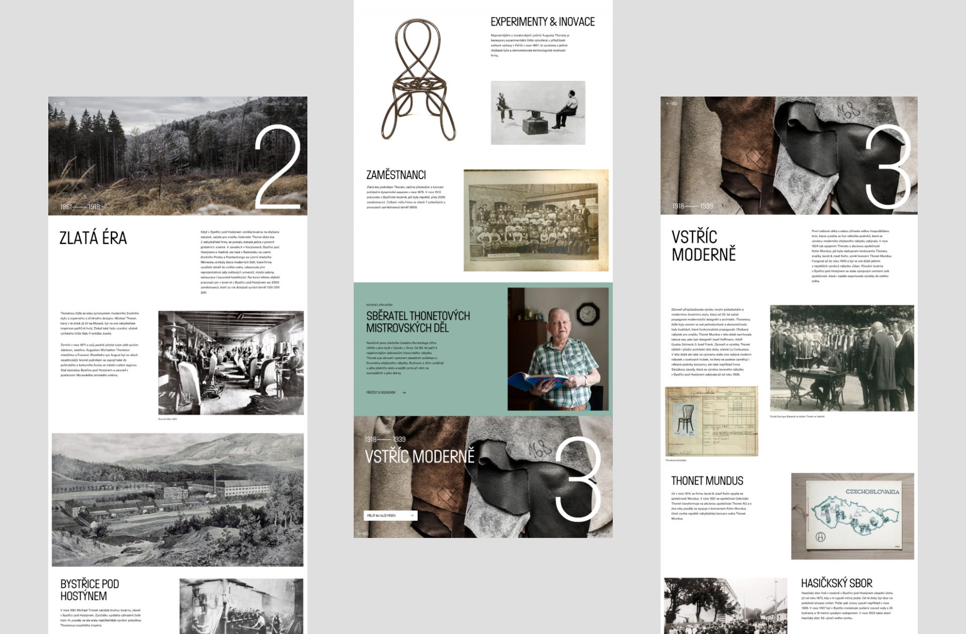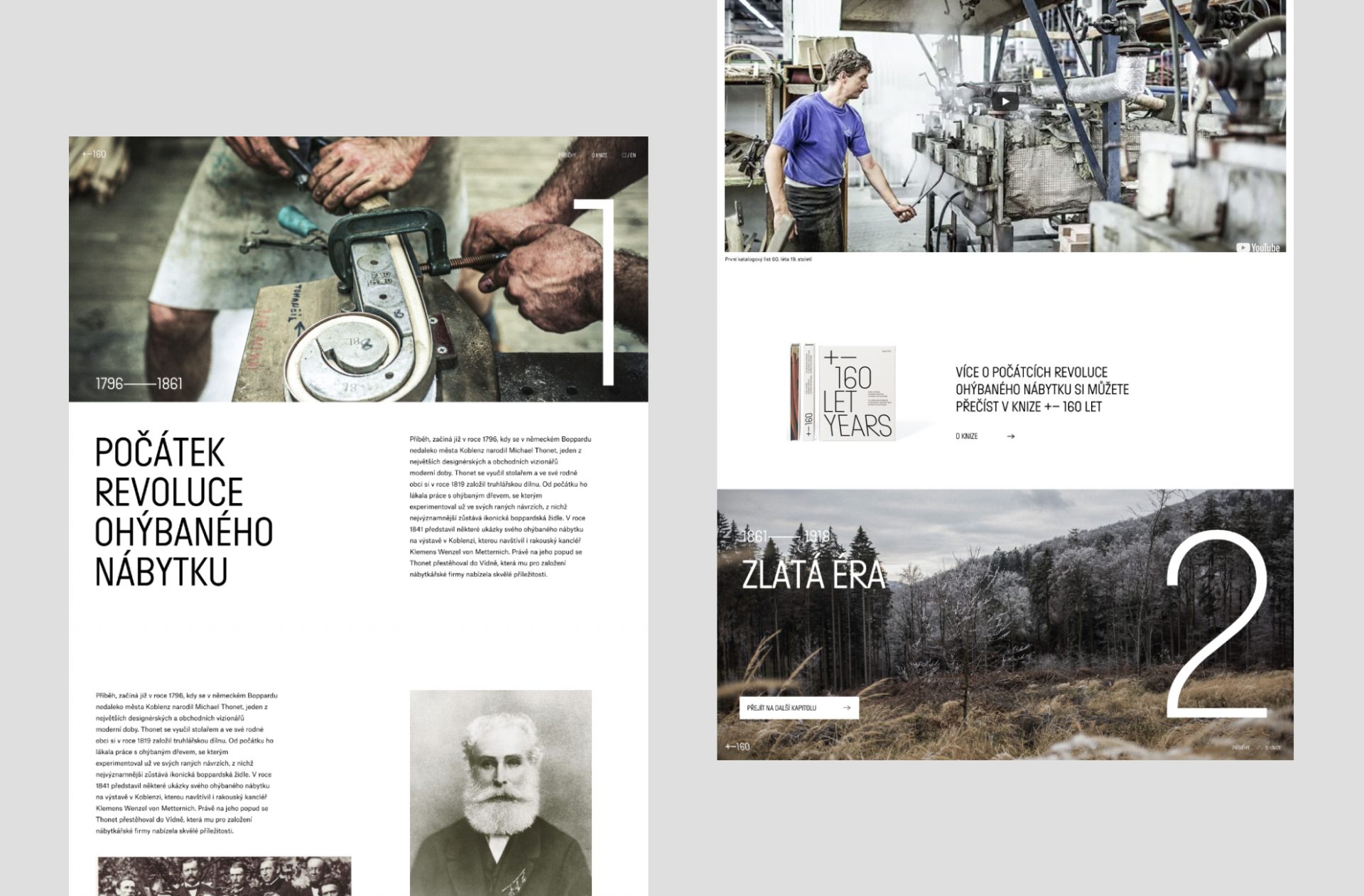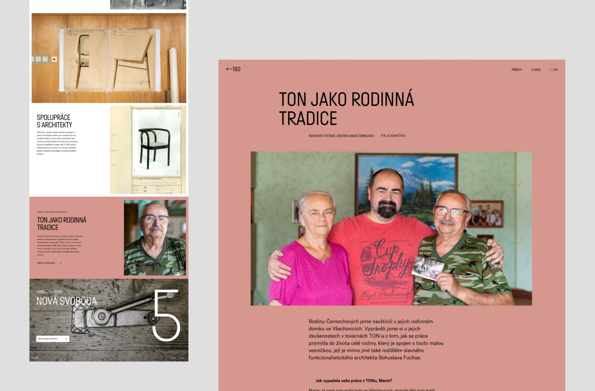 7 kapitol knihy jde ruku v ruce se 7 vývojovými obdobími ohýbaného nábytku značky TON, které ukazují jeho zlaté časy, ale nebojí se poodhalit i chvíle, kdy to tak růžové nebylo. Když jsem knihu držel v rukou poprvé, všiml jsem si jedné podstatné věci. Kniha mě svým příběhem krom textu provázela také designem. Tuto návaznost jsem chtěl přenést i do webu, ale zároveň jsem z knihy nechtěl prozradit úplně všechno.