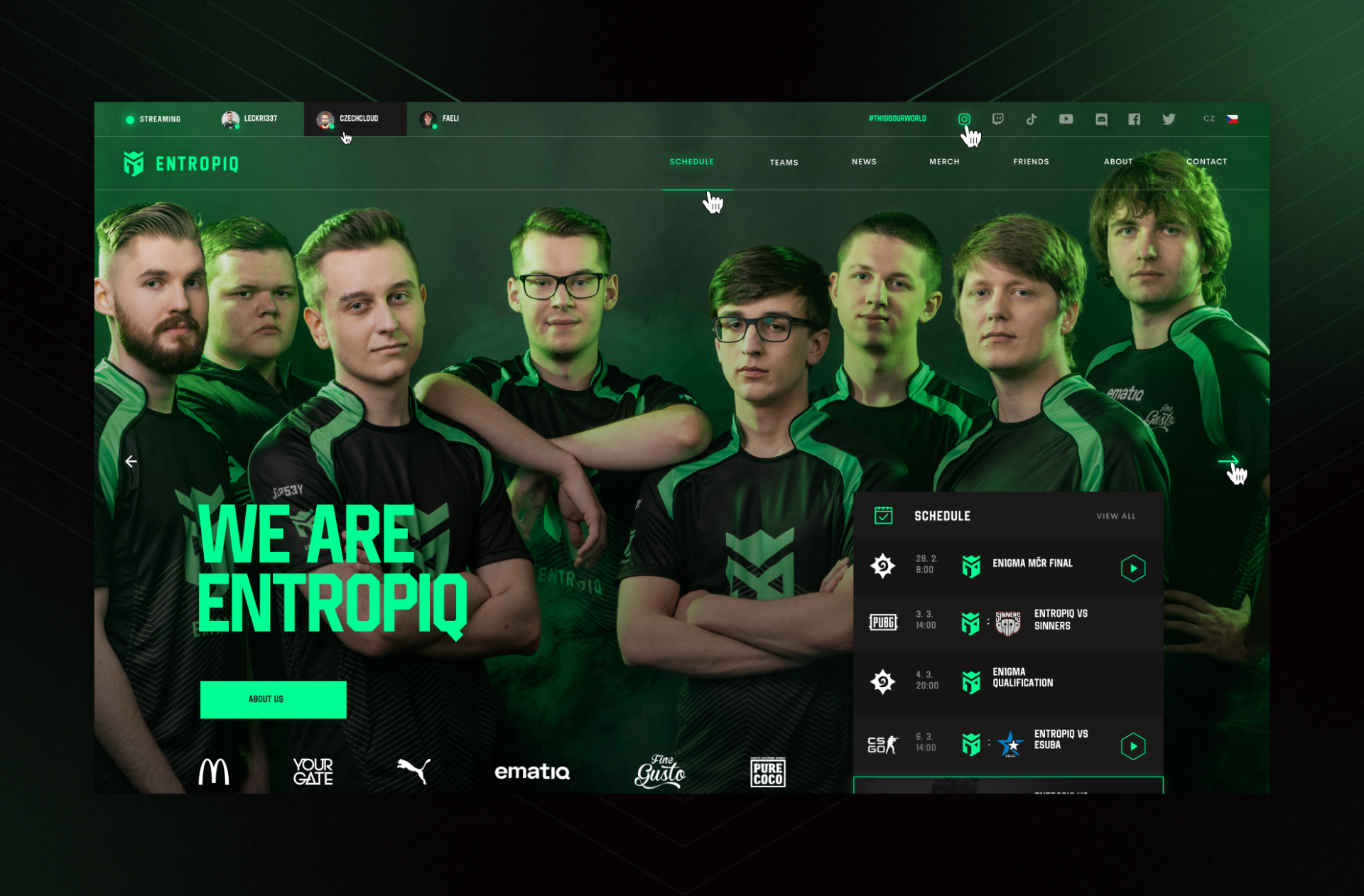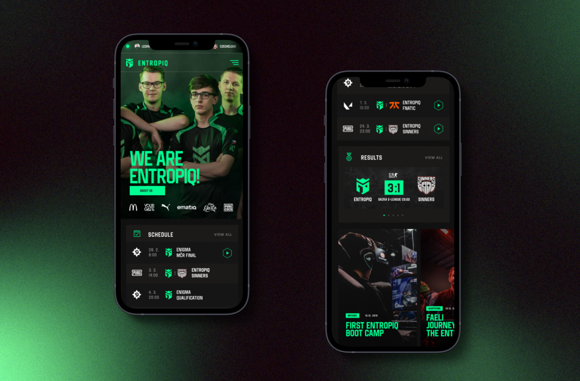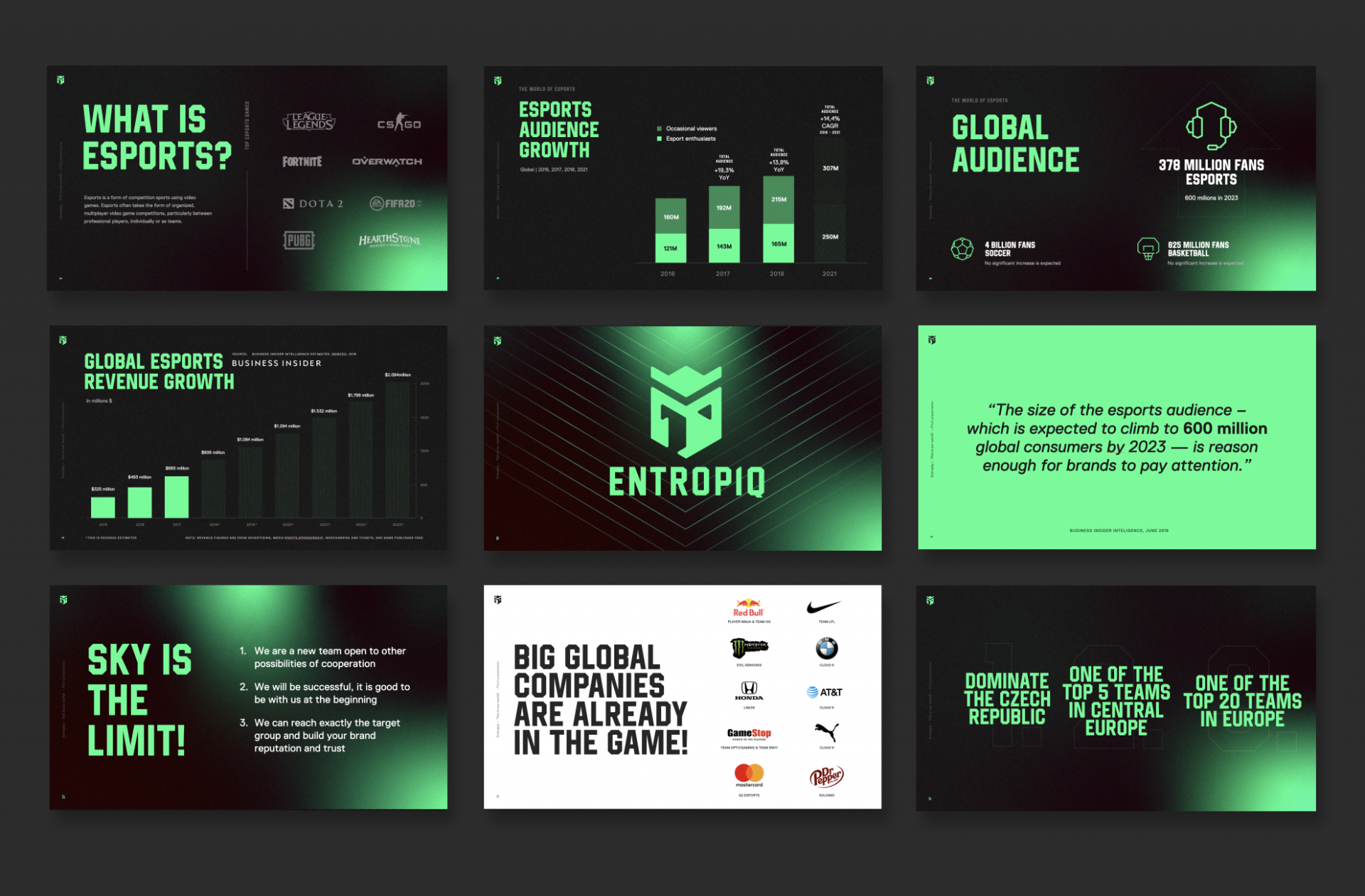 V lednu 2020 vstoupil na českou esportovou scénu nový ambiciózní tým – Entropiq. Od první chvíle potřeboval ukázat, že není jen dalším hráčem na trhu, ale vysoce profesionálním týmem se silným zázemím a odhodláním dobít Evropu. Když jsem viděl zadání vytvořit vizuální identitu a prezenční web, který tyto ambice bude odrážet, těšil jsem se na další zajímavou výzvu, kterou přede mě Entropiq postavil.